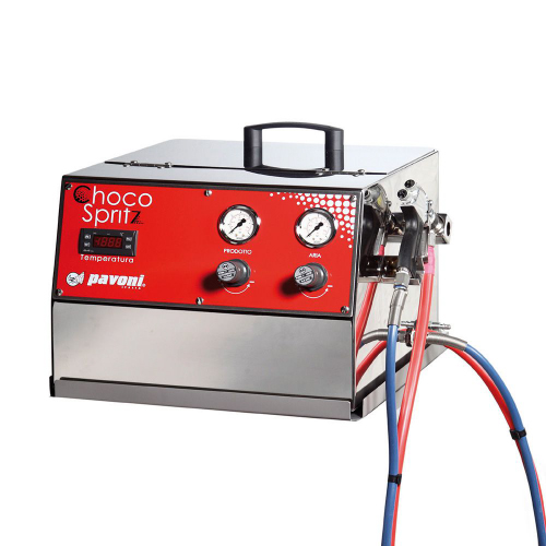 CIOCOSPRITZ – Uređaj za raspršivanje Čokolade. Napravljeno za prskanje temperirane čokolade i surogata. Ciocospritz omogućava regulaciju komprimiranog zraka i proizvoda odvojeno kako bi se dobio optimalan rezultat. Temperatura je podesiva do 60 ° C