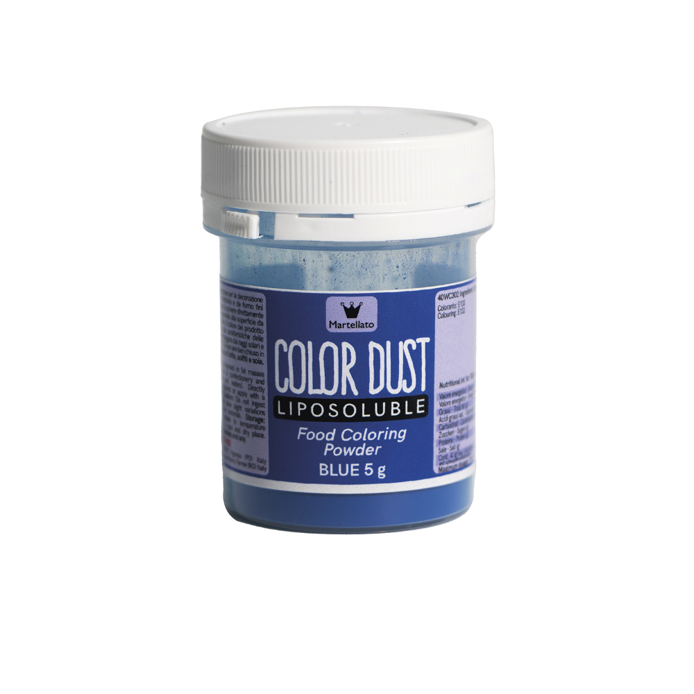 DUST BOJA U PRAHUDust boja u prahu topiva u mastima Plavo 5 gr. Prašak za bojenje hrane topljiv u mastima pogodan za masovno bojanje proizvoda na bazi masti kao što su čokolada, krema od maslaca, pasta od badema, šećerna pasta, parfe. Može se koristiti na površini s kistom takav kakav jest ili razrijeđen s tekućim šelakom kako bi se dobio proizvod za ukrašavanje kistom. Veličina pakiranja je 5 gr. Proizvodi Maretellato.