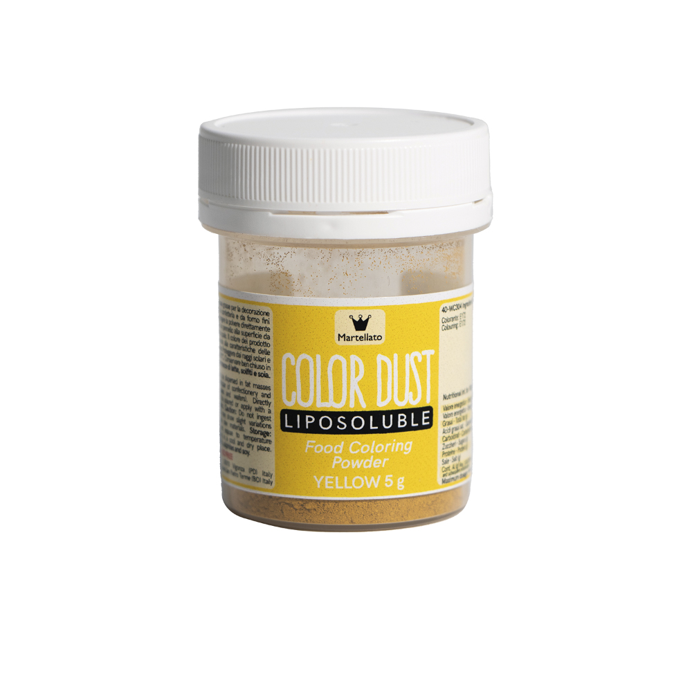 Dust boja u prahu topiva u mastima Žuto 5 gr. Prašak za bojenje hrane topljiv u mastima pogodan za masovno bojanje proizvoda na bazi masti kao što su čokolada, krema od maslaca, pasta od badema, šećerna pasta, parfe. Može se koristiti na površini s kistom takav kakav jest ili razrijeđen s tekućim šelakom kako bi se dobio proizvod za ukrašavanje kistom.