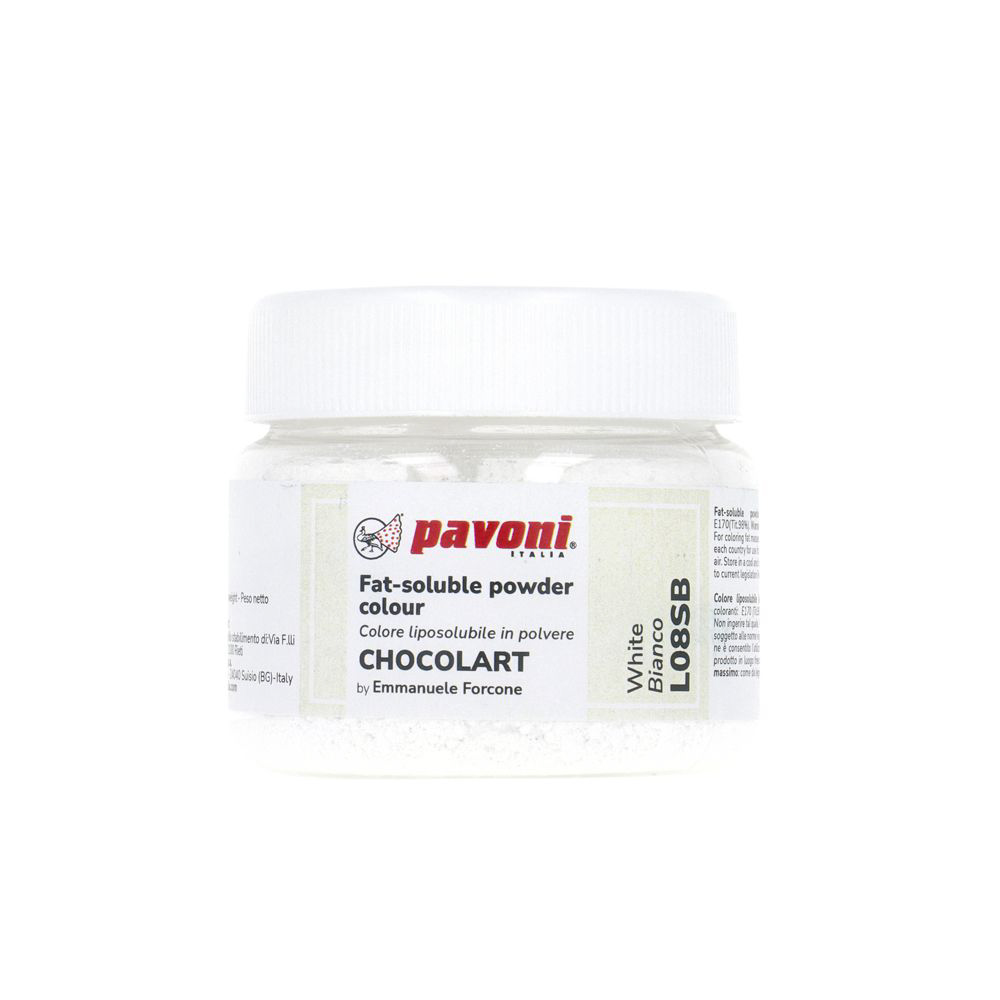 Jestiva boja u prahu topiva u mastima Bijelo 40 gr. Nova linija jestivih boja u prahu topivih u mastima visokog inteziteta. Za bojanje čokolade, kakao maslaca i svih slastičarskih proizvoda koji sadže masnoće.