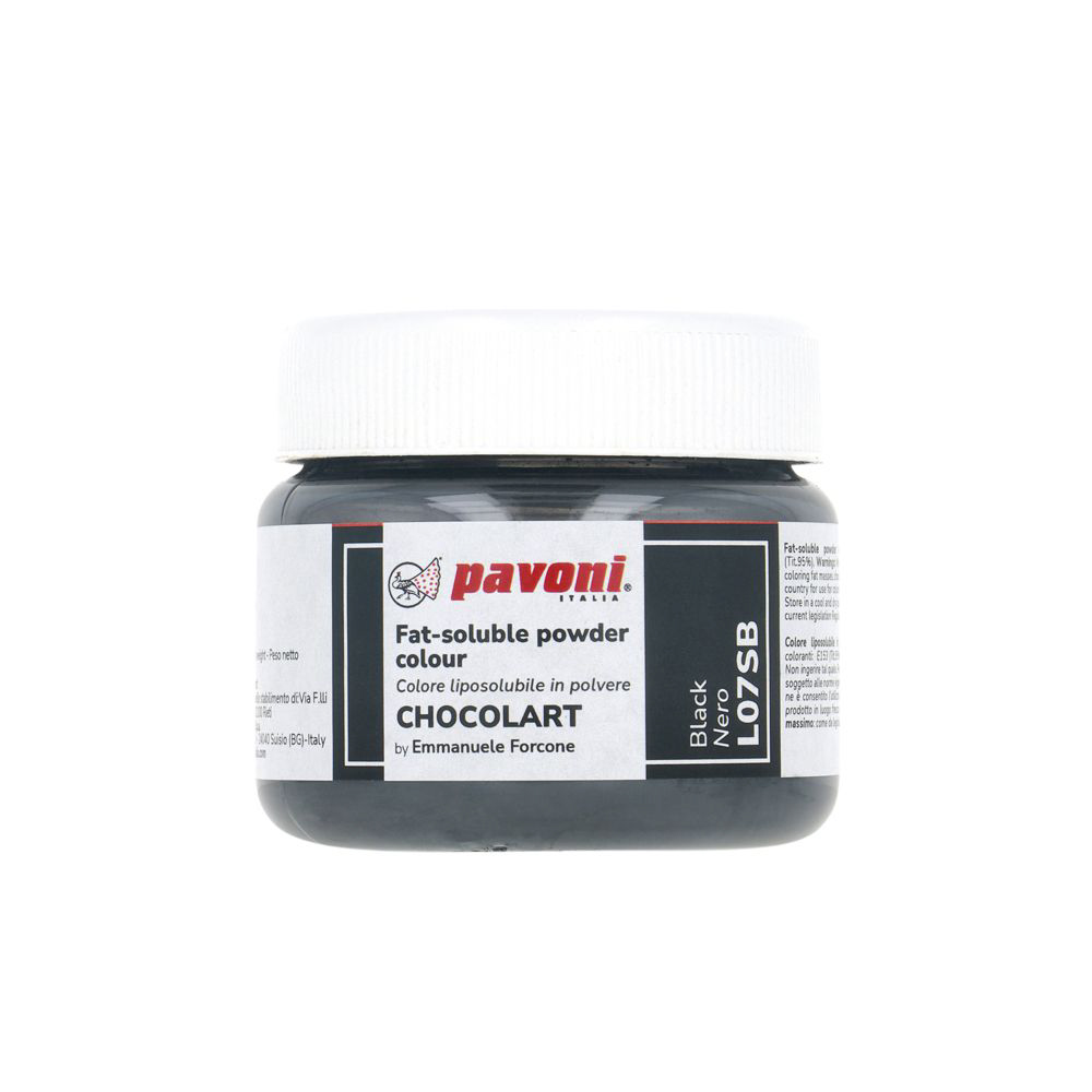 Jestiva boja u prahu topiva u mastima Crno 40 gr. Nova linija jestivih boja u prahu topivih u mastima visokog inteziteta. Za bojanje čokolade, kakao maslaca i svih slastičarskih proizvoda koji sadže masnoće.