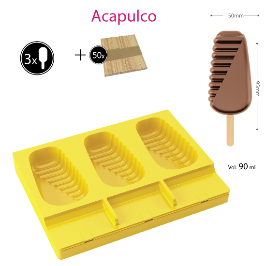 Set kalupa za sladoled Acapulco za 3 komada gotovog proizvoda. U pakiranju dolazi i 50 komada drvenih štapića za sladoled.
