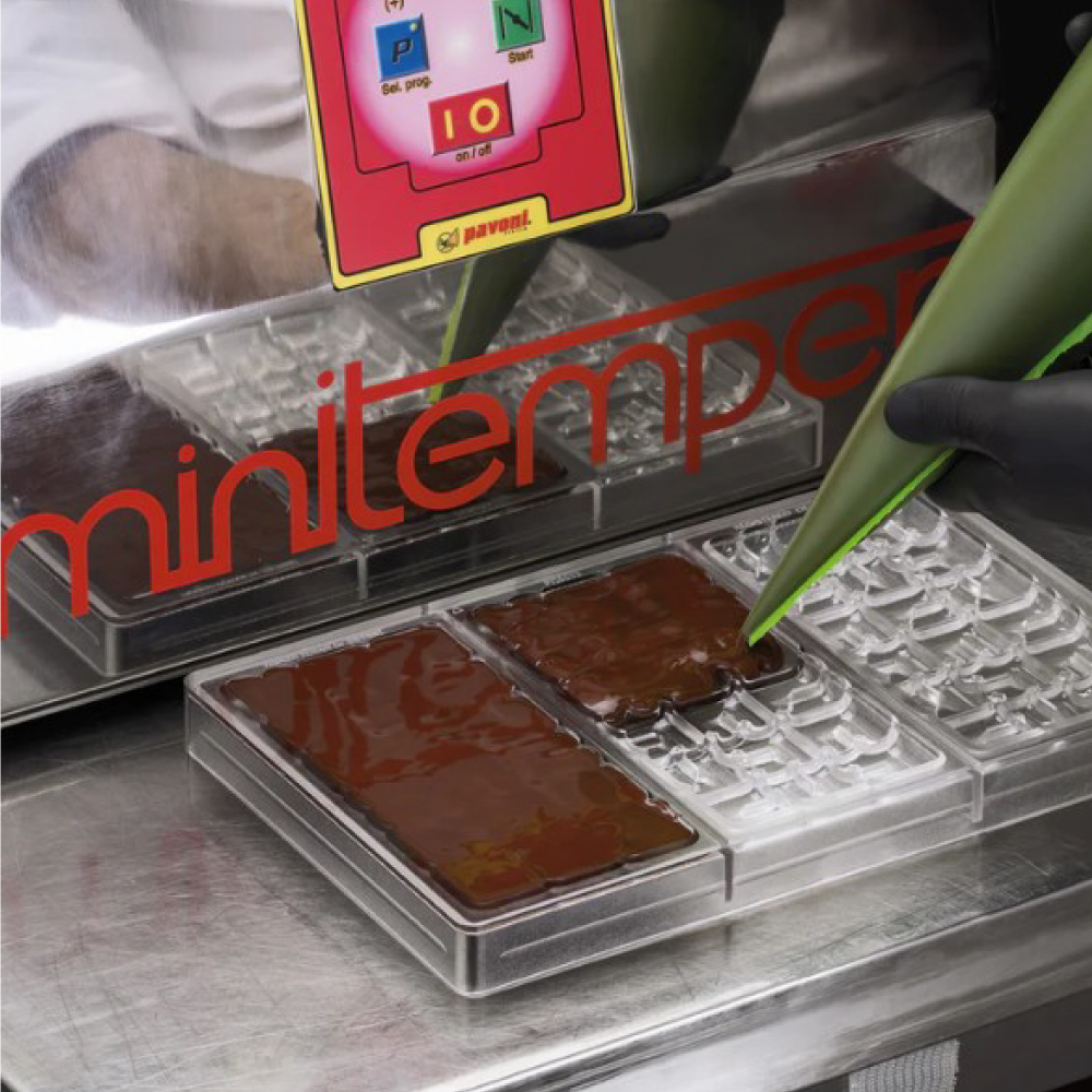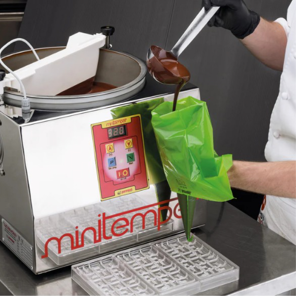 MINITEMPER- temperirka za čokoladu izrađena je od nehrđajućeg čelika AISI304, prozirni PET poklopac za održavanje temperature u potpunosti u skladu s higijenskim propisima. Personalizirani programi za topljenje i temperiranje čokolade. Malih dimenzija i jednostavna zauporabu.  Temperirka  izvrsnog omjerom kvalitete i cijene. Održava čokoladu na željenoj temperaturi i do nekoliko sati. Garancija 2 godine