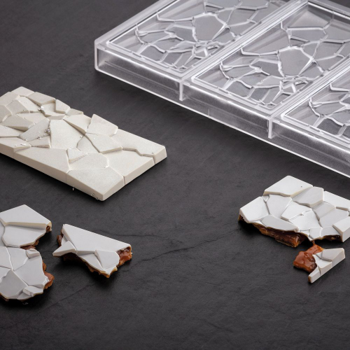 Polikarbonatni kalup za čokoladne table Crush stvoren u suradnji sa Fabriziom Fioranijem. Dimenzije gotovog proizvoda su 150x77x12 h ~ 100 g.