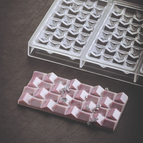 Polikarbonatni kalup za čokoladne table PIXIE stvoren u suradnji sa World Chocolate Master Fabrizio Fiorani. Dimenzije gotovog proizvoda su mm 154x77x11 h ~ 100 g. BPA Free