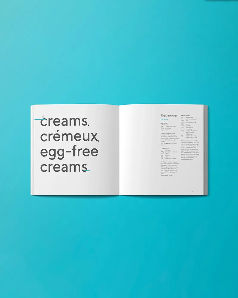 Recepti su podijeljeni u ukupno 12 tematskih kategorija (biskvit, kolači i peciva; kreme, crémeux, kreme bez jaja; sladoledi i sorbeti; gelovi, želei, voćne paštete itd.), što vam omogućuje da brzo pronađete ono što tražite i usporedite sve recepte klasificirane u tom odjeljku kako biste na kraju odabrali onaj koji vam najbolje odgovara.